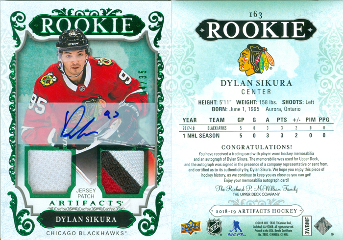 It is from 2018 Upper Deck Artifacts Auto Material Emerald worth $80.00