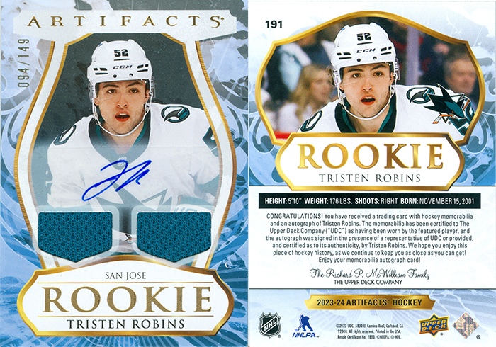 This is Tristen Robins's memorabilia card. Card number 191