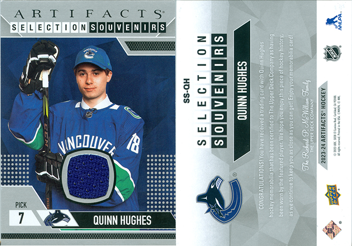 This is Quinn Hughes's memorabilia card. Card number SS-QH